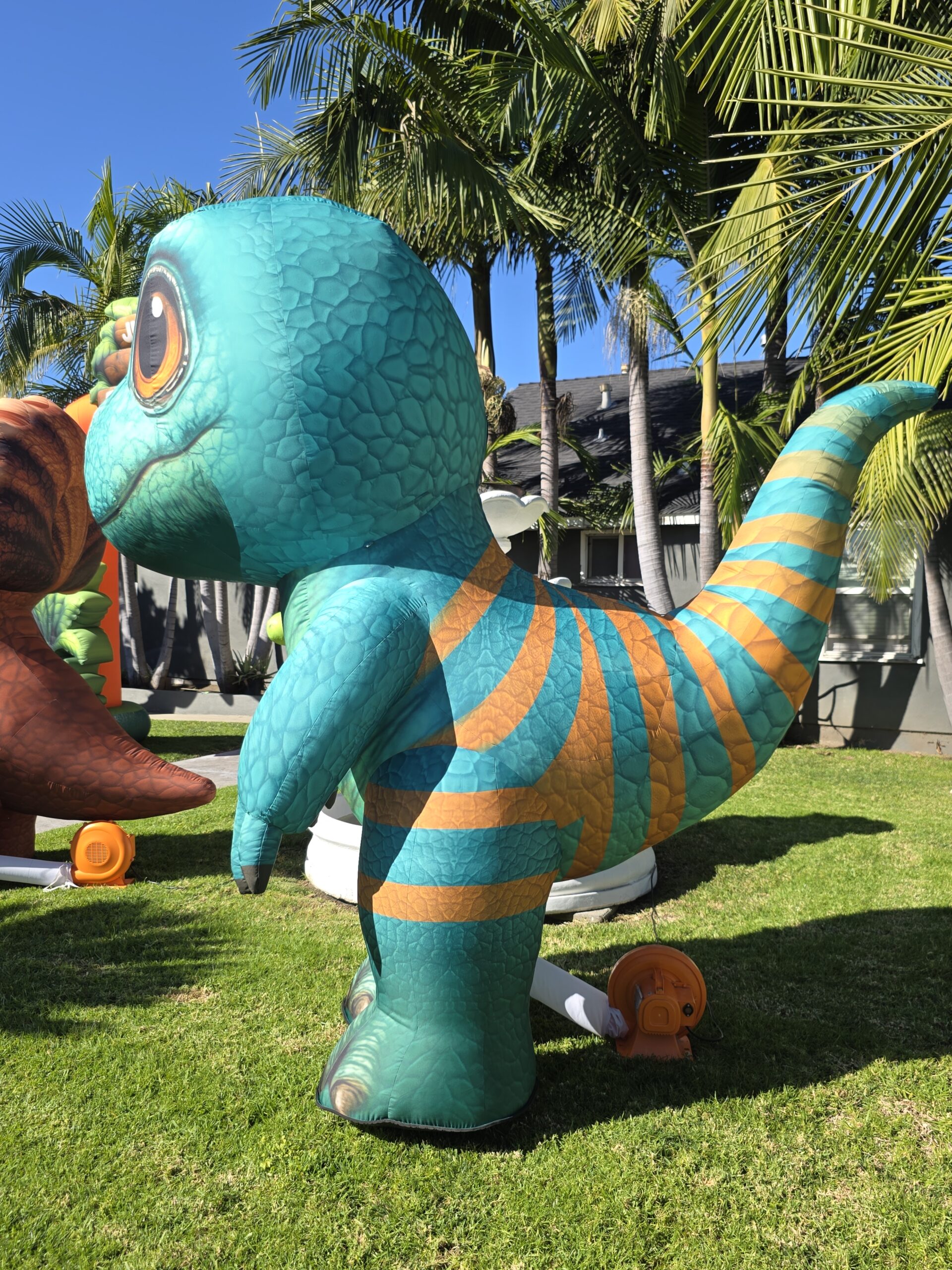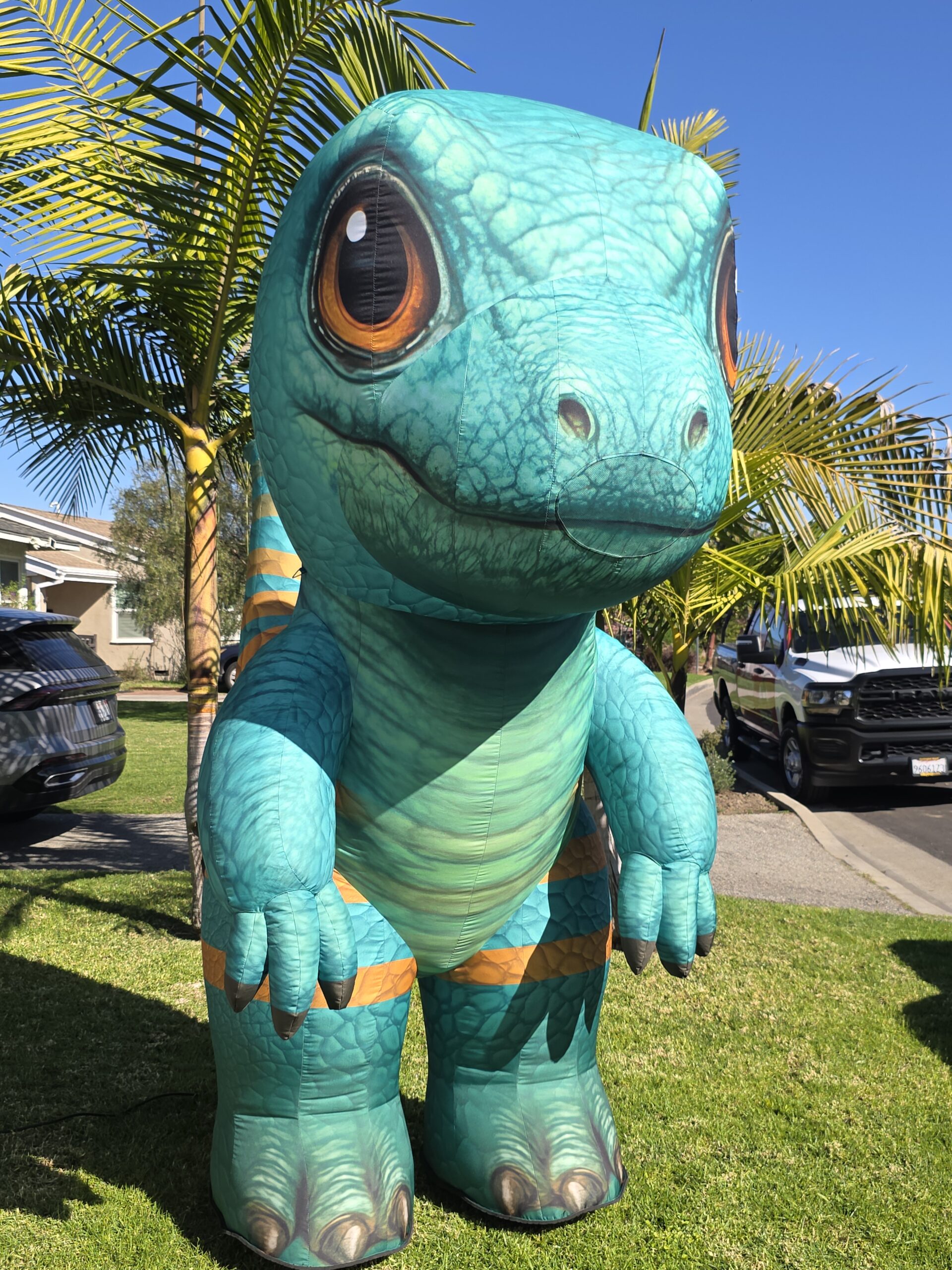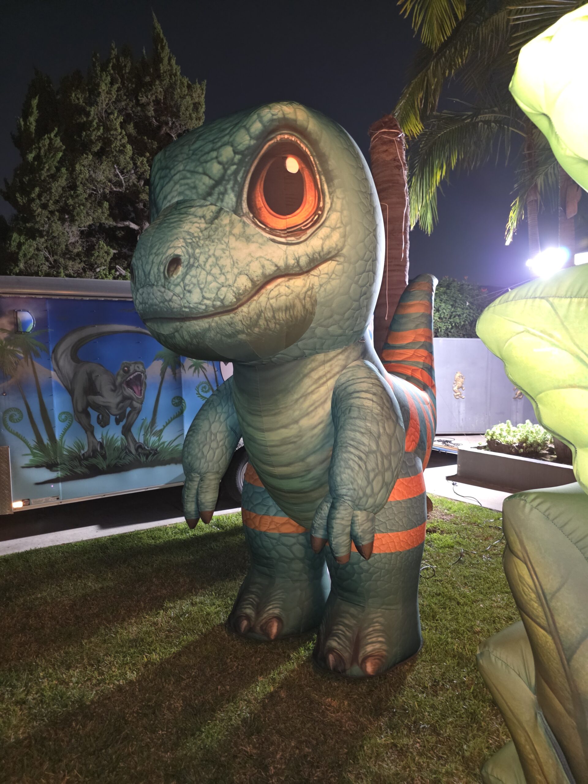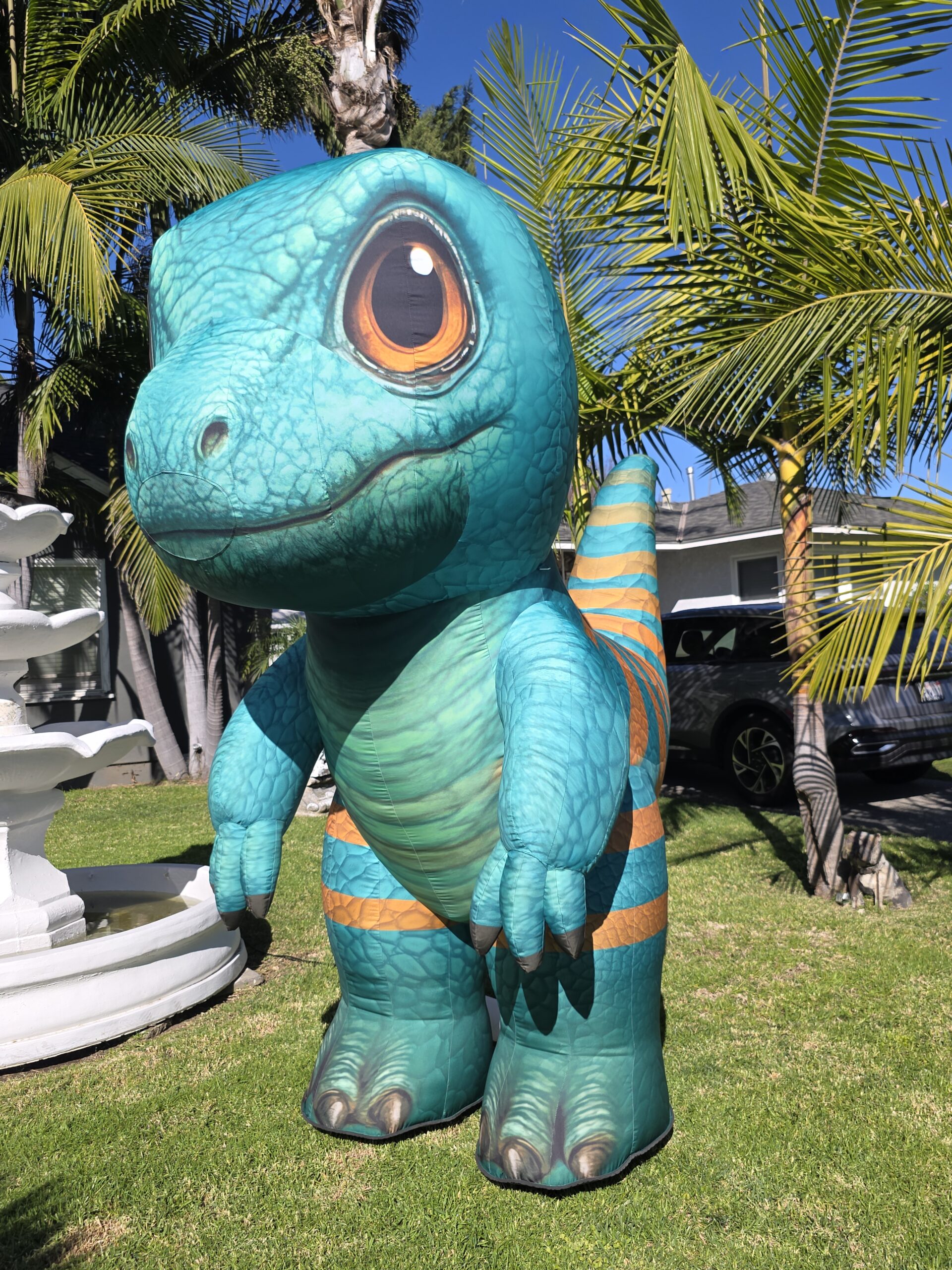 Standing approximately 8.2 ft (250 cm) tall and 7.1 ft (216 cm) long, this adorable yet adventurous raptor is the perfect mix of exciting and kid-friendly. Its bright colors, big eyes, and playful design make it a hit with younger guests while still keeping that Jurassic vibe.