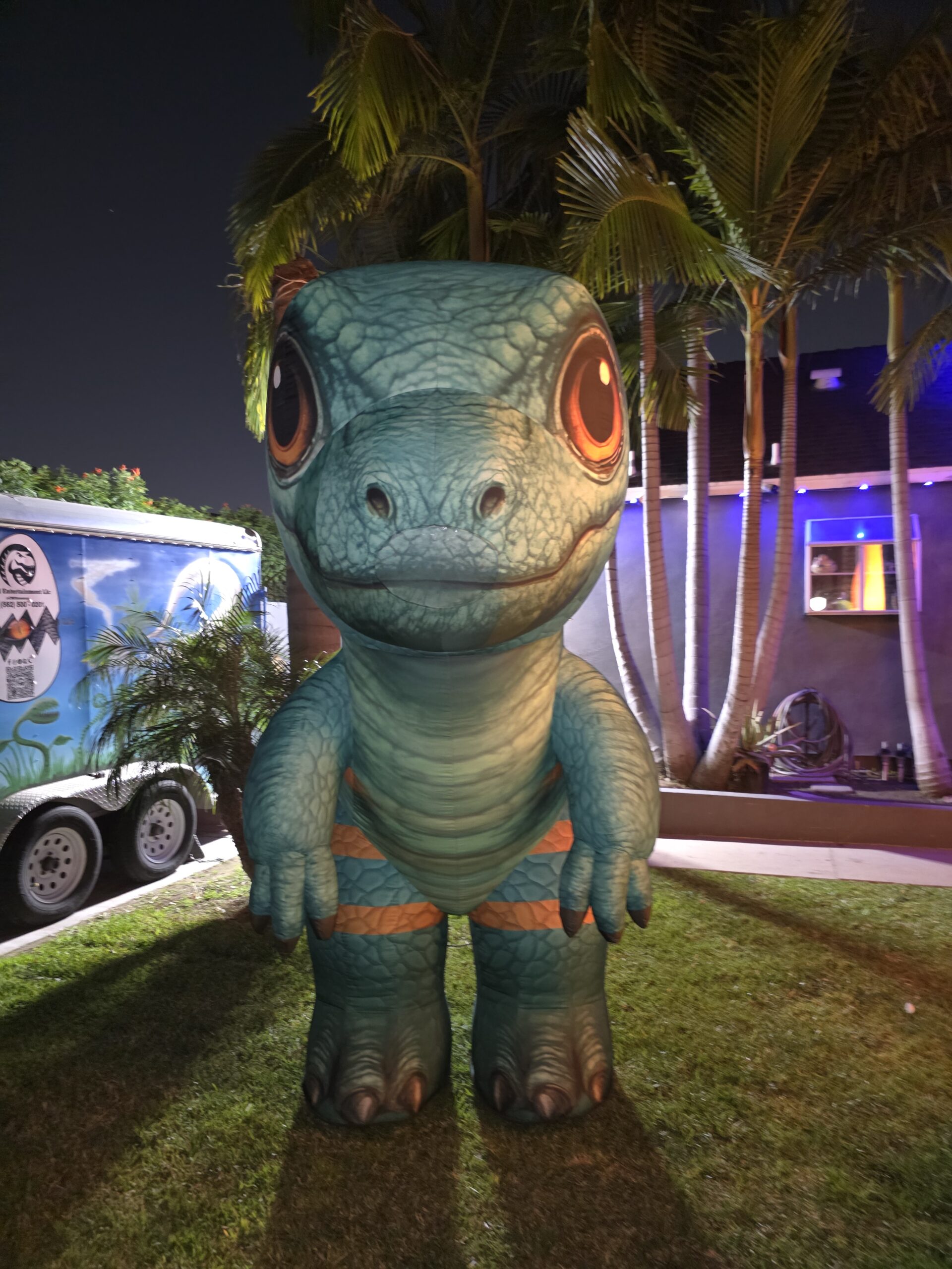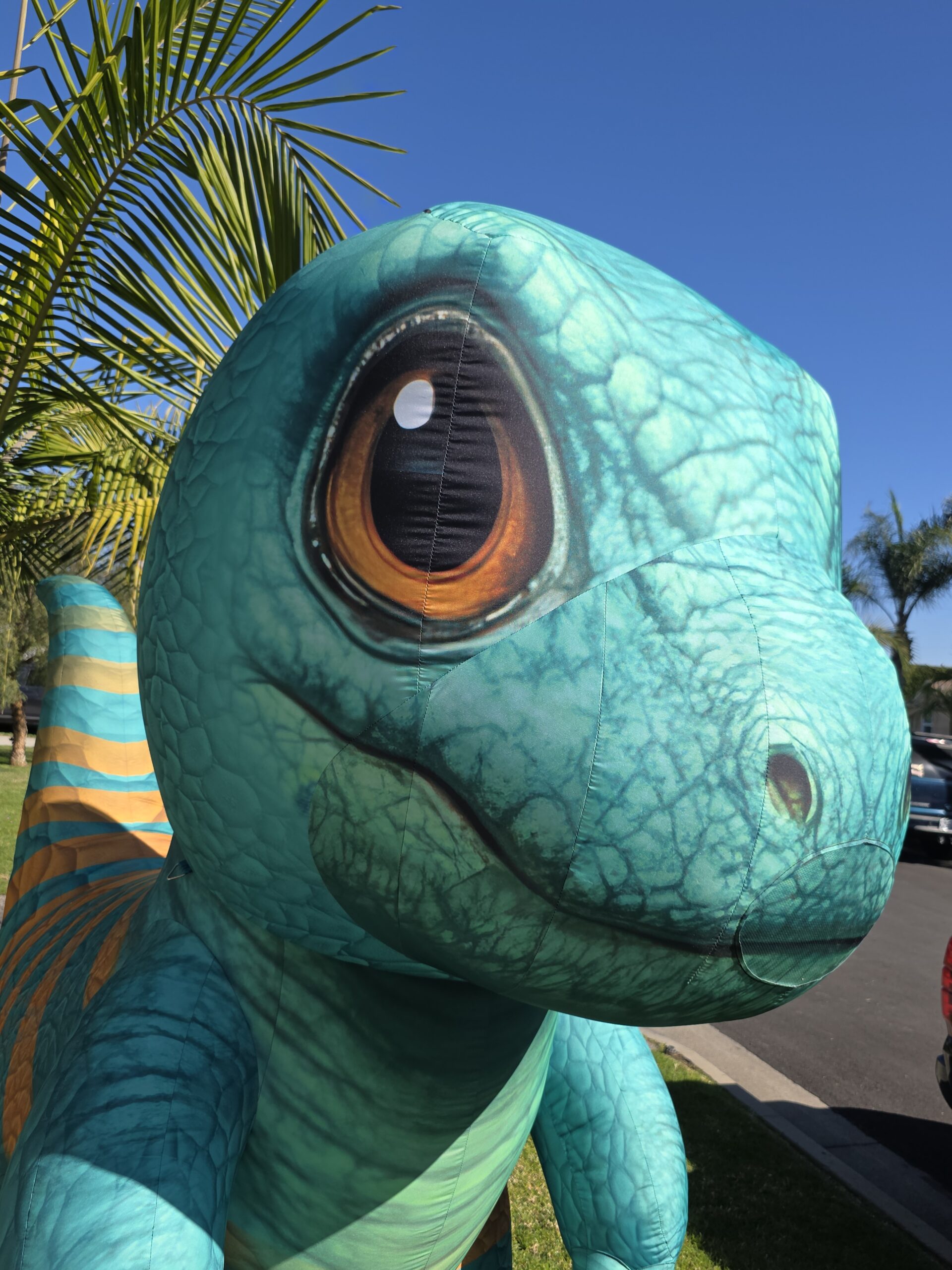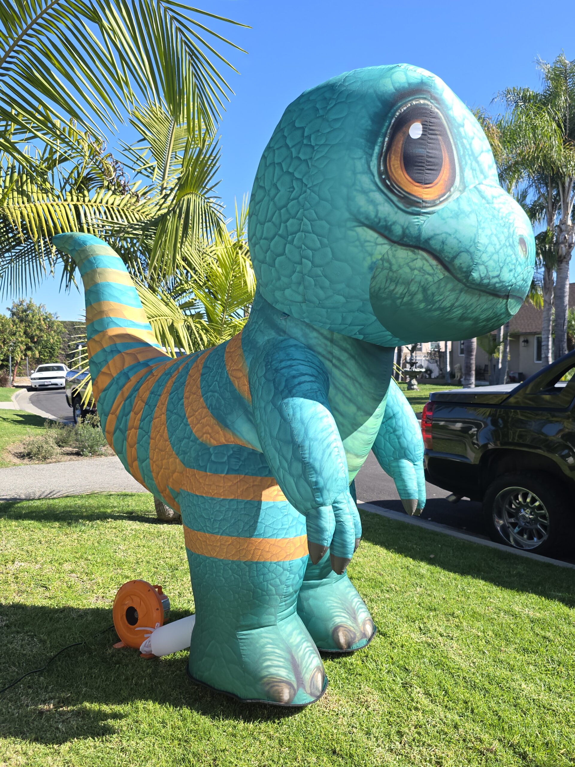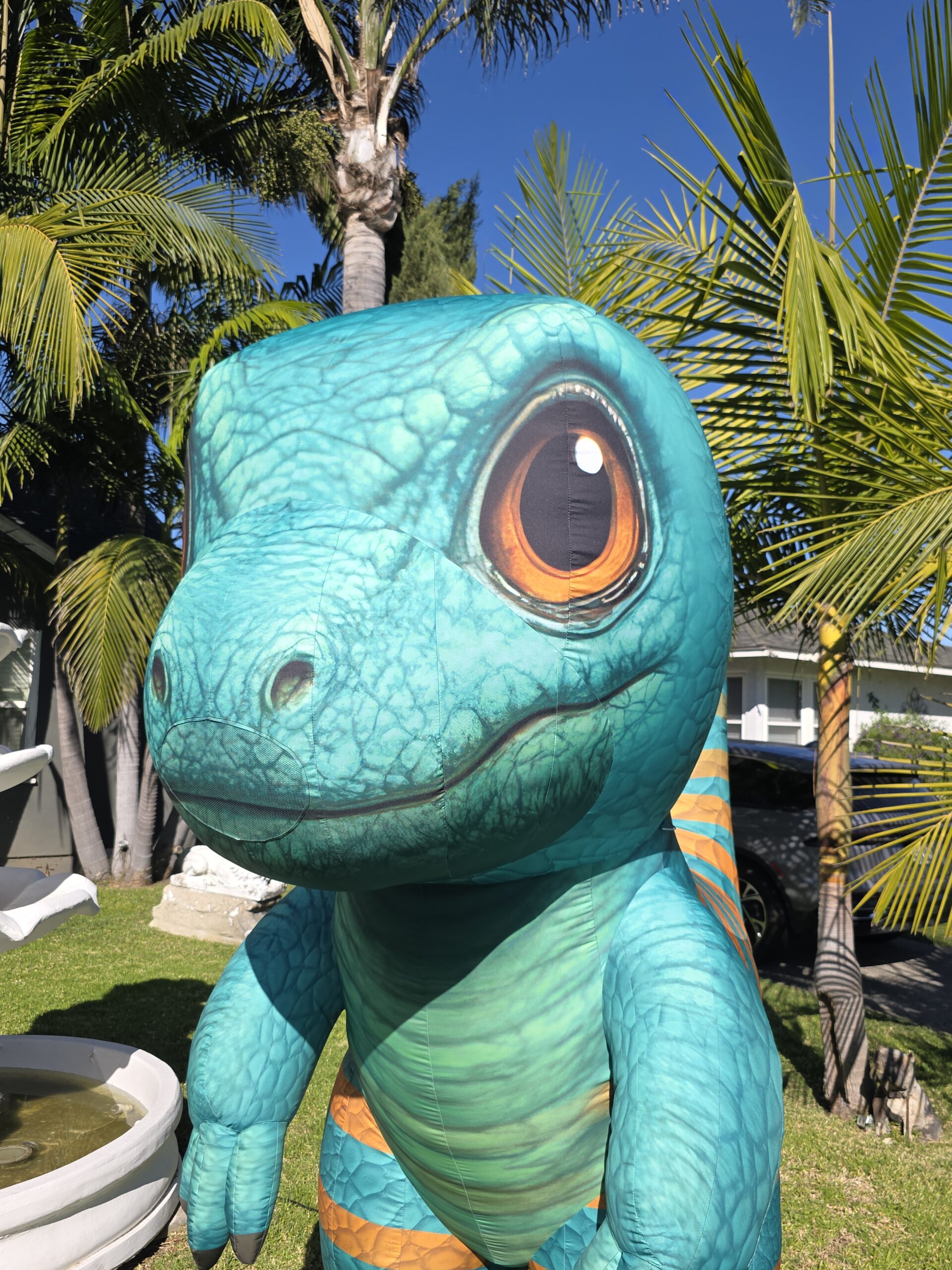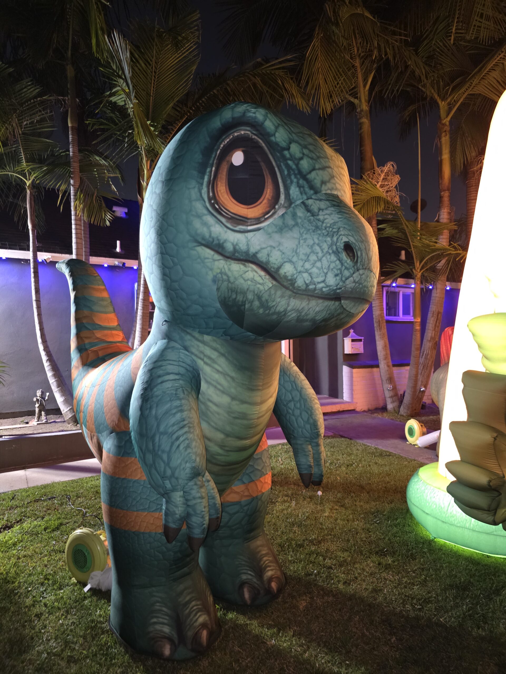 Standing approximately 8.2 ft (250 cm) tall and 7.1 ft (216 cm) long, this adorable yet adventurous raptor is the perfect mix of exciting and kid-friendly. Its bright colors, big eyes, and playful design make it a hit with younger guests while still keeping that Jurassic vibe.