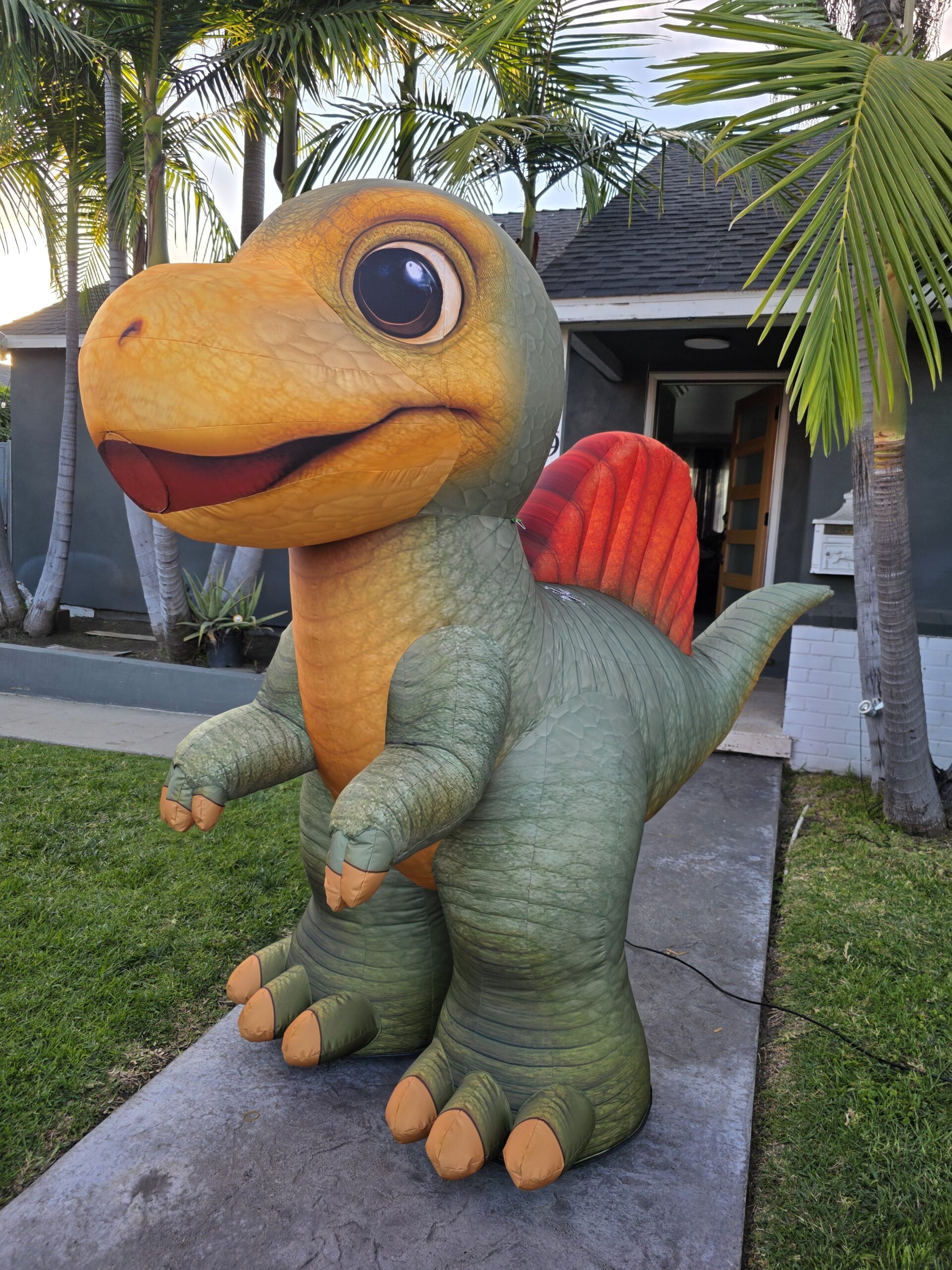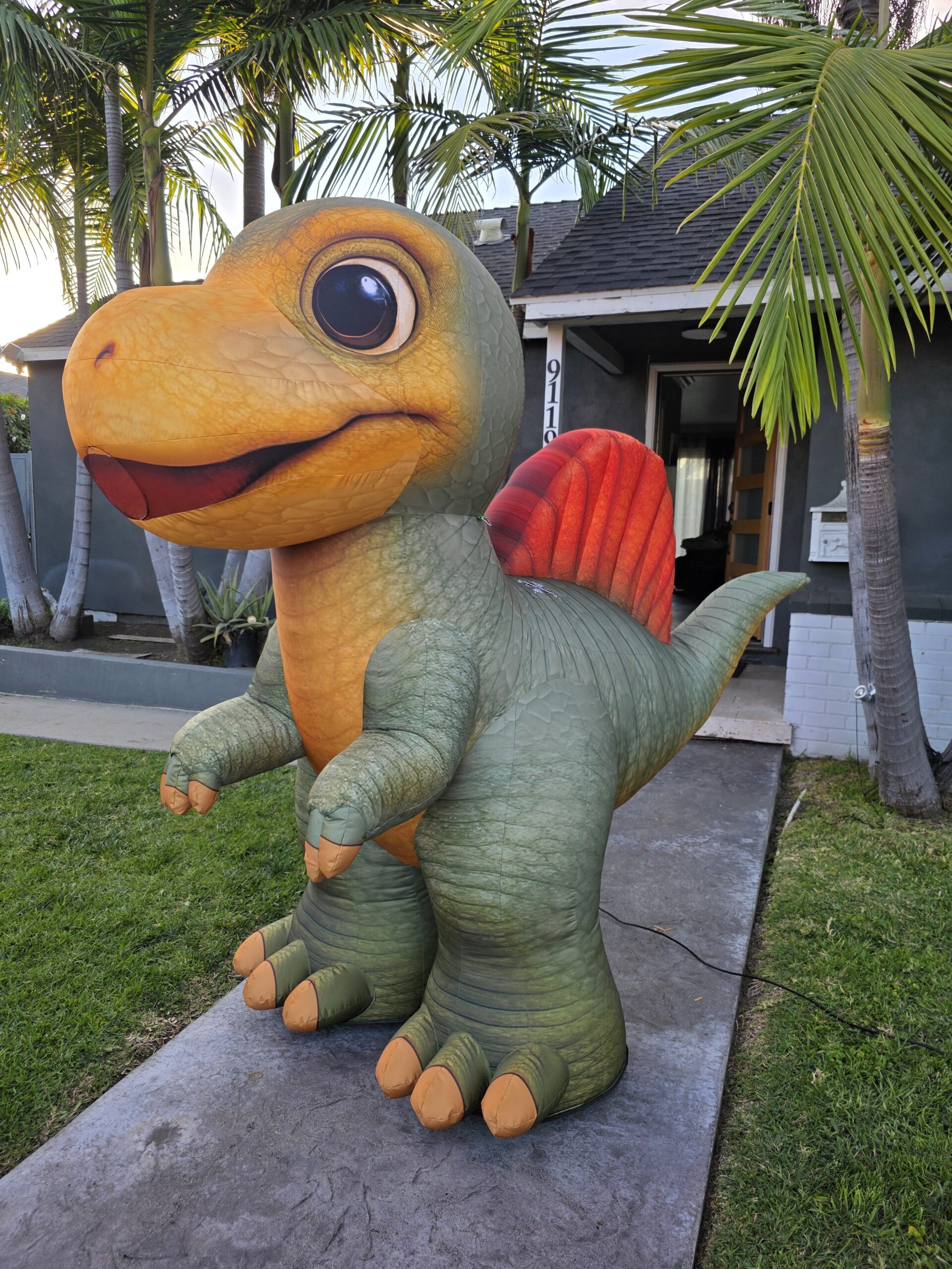 Standing approximately 6.5 ft (200 cm) tall and 7 ft (212 cm) long, this playful Spinosaurus features its iconic sail back and a friendly, colorful design that makes it perfect for kids events. It’s the ideal mix of eye-catching and approachable, making it great for photos and party decoration.